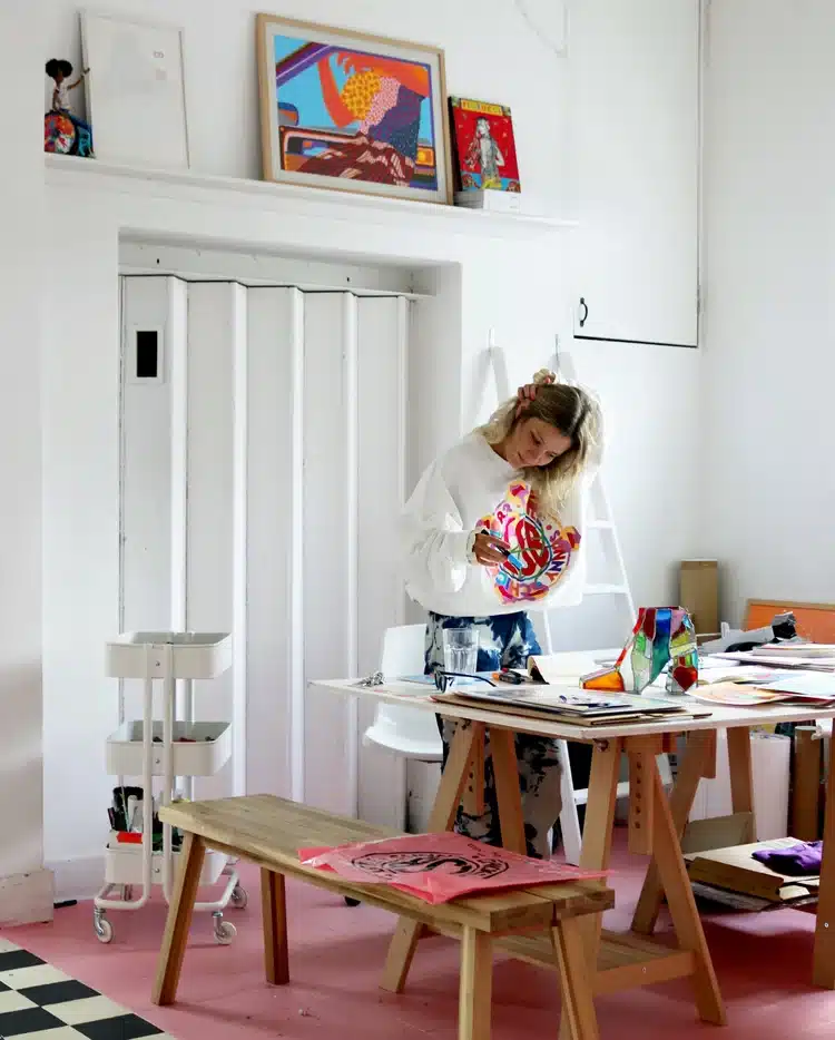 Inspirée par la nature finlandaise, fascinée par les motifs floraux comme les automobiles, elle mixe influences Pop et couleurs intenses.